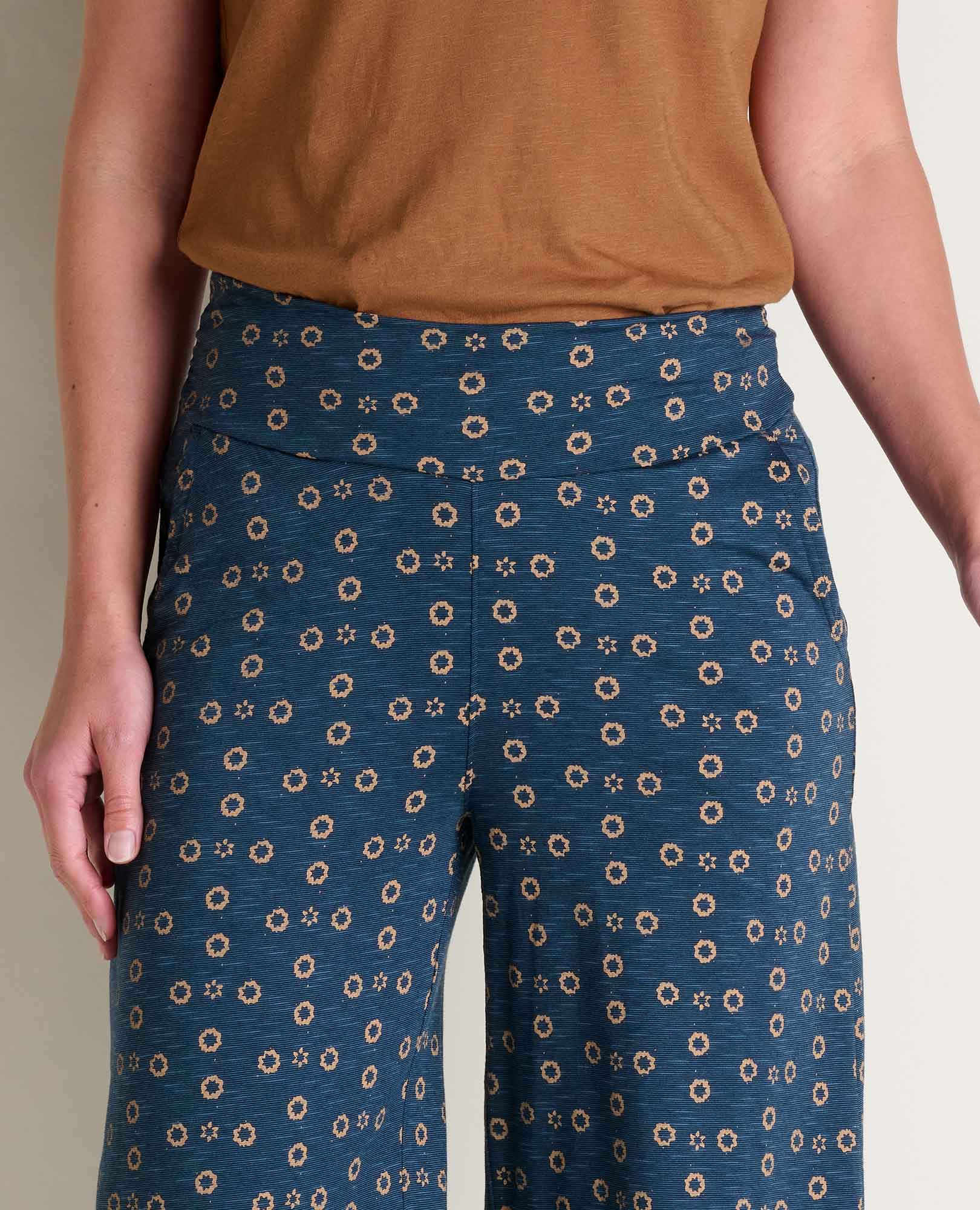 Fit: Wide leg crop fit, ruched elastic waistband, mid rise, 25 inch inseam